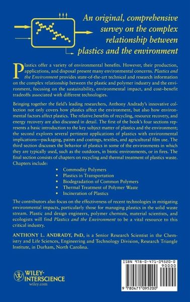 Plastics offer a variety of environmental benefits. However, their production, applications, and disposal present many environmental concerns. Plastics and the Environment provides state-of-the-art technical and research information on the complex relationship between the plastic and polymer industry and the environment, focusing on the sustainability, environmental impact, and cost--benefit tradeoffs associated with different technologies.