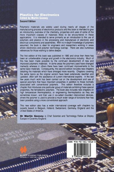 The first edition of this book was published in 1985 and since then there has been an unbelievable change and growth in the electronics industry. Much of this has been made possible by the continued development of new and improved polymeric materials. In some areas the polymers used have changed markedly whereas in others there have been continued improvements to the same basic materials. Consequently, this second edition includes new chapters detailing the materials which have emerged more recently. Chapters covering the same topics as the original version have been extensively rewritten and updated, often with the assistance of current international experts. In the last few years much work has been carried out on the development and use of special polymers that have important properties in addition to those normally associated with conventional polymers. This edition therefore includes a chapter that introduces one particular group of materials exhibiting these special properties, the ferroelectric polymers. The book also includes new chapters on high temperature thermoplastics, or engineering plastics as they are sometimes known, and their use in so-called moulded interconnect devices, where the polymer is used to provide a much wider range of functions than has been possible using a more conventional approach.