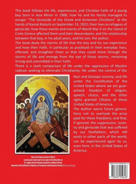 This book follows the life, experiences, and Christian Faith of a young boy born in Asia Minor in 1908; how he and his family managed to escape the Genocide of the Greek and Armenian Christians at the hands of Kemal Ataturk on September 13, 1922; their lives as refugees of genocide; how these events and events of World War II on the Island of Crete Greece affected them and their descendants; and the relationship between that boy, in his adult years, and his son, the author. The book deals with life's storms that the boy and his son experience how their Faith, in particularly as practiced in their everyday lives, effected, and straighten them so that they could move through the storms of life and emerge from the eye of those storms, remaining strong and committed in their Faith. There is a strake comparison of life under the oppression of Muslim radicals seeking to eliminate Christianity; life under the control of the Nazi and Gestapo tyranny; and life under the Constitution of the United States where we are guaranteed freedom of religion, speech, choice, and the other rights granted Citizens of these United States of America. The author warns future generations do not overlook the price paid for these freedoms; and that, if ignored, the suppression, tyranny and genocide that was suffered by our forefathers, which still exists in other parts of the world, can be experienced again by us, even here, in the United States of America.