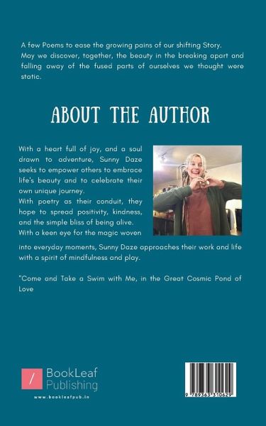 ""With a heart full of joy, and a soul drawn to adventure, Sunny Daze seeks to empower others to embrace life's beauty and to celebrate their own unique journey. With poetry as their conduit, they hope to spread positivity, kindness, and the simple bliss of being alive. With a keen eye for the magic woven into everyday moments, Sunny Daze approaches their work and life with a spirit of mindfulness and play. """"Come and Take a Swim with Me, in the Great Cosmic Pond of Love""