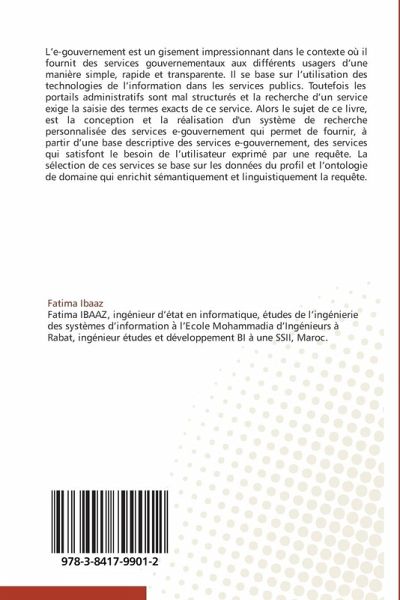 L'e-gouvernement est un gisement impressionnant dans le contexte où il fournit des services gouvernementaux aux différents usagers d'une manière simple, rapide et transparente. Il se base sur l'utilisation des technologies de l'information dans les services publics. Toutefois les portails administratifs sont mal structurés et la recherche d'un service exige la saisie des termes exacts de ce service. Alors le sujet de ce livre, est la conception et la réalisation d'un système de recherche personnalisée des services e-gouvernement qui permet de fournir, à partir d'une base descriptive des services e-gouvernement, des services qui satisfont le besoin de l'utilisateur exprimé par une requête. La sélection de ces services se base sur les données du profil et l'ontologie de domaine qui enrichit sémantiquement et linguistiquement la requête.