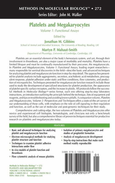 12 The average human body has in the order of 10 circulating platelets. They are crucial for hemostasis, and yet excessive platelet activation is a major cause of m- bidity and mortality in western societies. It is therefore not surprising that platelets have become one of the most extensively investigated biological cell types. We are, however, far from understanding precisely how platelets become activated under physiological and pathophysiological conditions. In addition, there are large gaps in our knowledge of platelet production from their giant precursor cell, the megakar- cyte. Understanding megakaryocyte biology will be crucial for the development of platelet gene targeting. The aim of Platelets and Megakaryocytes is therefore to bring together established and recently developed techniques to provide a comprehensive guide to the study of both the platelet and the megakaryocyte. It consists of five s- tions split between two volumes. The more functional assays appear in Volume 1, whereas Volume 2 includes signaling techniques, postgenomic methods, and a n- ber of key perspectives chapters. Part I of Volume 1, Platelets and Megakaryocytes: Functional Assays, describes many well established approaches to the study of platelet function, including aggregometry, secretion, arachidonic acid metabolism, procoagulant responses, pla- let adhesion under static or flow conditions, flow cytometry, and production of microparticles. Although one would ideally wish to perform experiments with human platelets, studies within the circulation using intravital microscopy require the use of animal models, which are described in Chapter 16, vol. 1.