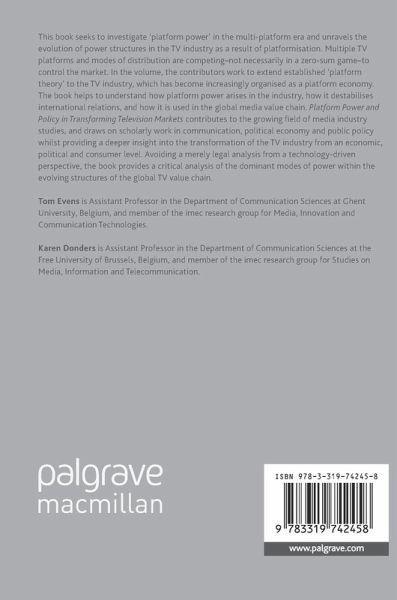 This book seeks to investigate 'platform power' in the multi-platform era and unravels the evolution of power structures in the TV industry as a result of platformisation. Multiple TV platforms and modes of distribution are competing-not necessarily in a zero-sum game-to control the market. In the volume, the contributors work to extend established 'platform theory' to the TV industry, which has become increasingly organised as a platform economy. The book helps to understand how platform power arises in the industry, how it destabilises international relations, and how it is used in the global media value chain. Platform Power and Policy in Transforming Television Markets contributes to the growing field of media industry studies, and draws on scholarly work in communication, political economy and public policy whilst providing a deeper insight into the transformation of the TV industry from an economic, political and consumer level. Avoiding a merely legal analysis from a technology-driven perspective, the book provides a critical analysis of the dominant modes of power within the evolving structures of the global TV value chain.