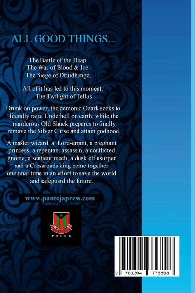 The Battle of the Heap. The War of Blood and Ice. The Siege of Druidhenge. All of it has led to this moment: The Twilight of Tellus. Drunk on power, the demonic Ozark seeks to literally raise Underhell on earth, while the murderous Old Shuck prepares to finally remove the Silver Curse and attain godhood. A master wizard, a Lord-errant, a pregnant princess, a repentant assassin, a conflicted gnome, a sentient mech, a dusk elf usurper and a Crossroads king come together one final time in an effort to save the world and safeguard the future.
