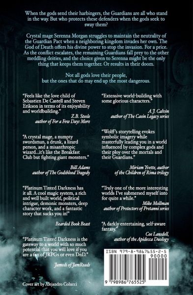The Kingdom of Boulom has been lost. The realms have already seen what happens when the Gods and their Harbingers are left unchecked. Destruction. Chaos. Death. The Gods can't be trusted. No one knows that better than David Williams, the Leader of the Guardians tasked to protect the Realm from the Gods and their powerful Harbingers ever since the fall of Boulom. Six Guardians take their pledge to leave the squabbles of the kingdoms behind and live only to stop the Harbingers and protect the Realms from the Gods. Serenna Morgan, a famed Crystal Mage and Guardian, struggles with the Guardian Pact when the Kingdom of Terrangus invades her home. She's supposed to stay out of it. But she can't. When she breaks her Oath and joins in the skirmish, she earns the favor of the God of Death when the conflict escalates to an all-out war. And he makes her an offer, one that'll make sure she'll never fail in her goals again. To become his Harbinger. To partake in the ecstasy of destruction.