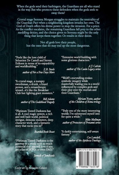 The Kingdom of Boulom has been lost. The realms have already seen what happens when the Gods and their Harbingers are left unchecked. Destruction. Chaos. Death. The Gods can't be trusted. No one knows that better than David Williams, the Leader of the Guardians tasked to protect the Realm from the Gods and their powerful Harbingers ever since the fall of Boulom. Six Guardians take their pledge to leave the squabbles of the kingdoms behind and live only to stop the Harbingers and protect the Realms from the Gods. Serenna Morgan, a famed Crystal Mage and Guardian, struggles with the Guardian Pact when the Kingdom of Terrangus invades her home. She's supposed to stay out of it. But she can't. When she breaks her Oath and joins in the skirmish, she earns the favor of the God of Death when the conflict escalates to an all-out war. And he makes her an offer, one that'll make sure she'll never fail in her goals again. To become his Harbinger. To partake in the ecstasy of destruction.