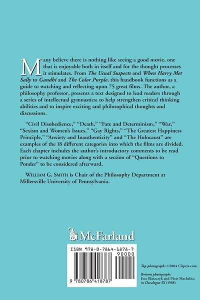 Many believe there is nothing like seeing a good movie, one that is enjoyable both in itself and for the thought processes it stimulates. From The Usual Suspects and When Harry Met Sally to Gandhi and The Color Purple, this handbook functions as a guide to watching and reflecting upon 75 great films. The author, a philosophy instructor, presents a text designed to lead readers through a series of intellectual gymnastics; to help strengthen critical thinking abilities and to inspire exciting and philosophical thoughts and discussions. Civil Disobedience, Death, Fate and Determinism, War, Sexism and Women's Issues, Gay Rights, The Greatest Happiness Principle, Anxiety and Inauthenticity and The Holocaust are examples of the 18 different categories into which the films are divided. Each chapter includes the authors introductory comments to be read prior to watching movies along with a section of Questions to Ponder to be considered afterward. Photographs of many movie scenes are included throughout the text.
