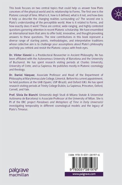 This book focuses on two central topics that could help us answer how Plato conceives of the physical world and its relationship to Forms. The first one is the Platonic concept of time. What is it, how is it defined, what is it not, and how does it help us describe the changing realities surrounding us? The second one is Plato's understanding of the perceptible world. How is it related to Forms, and how exactly does it work? These are central, wide-ranging, and highly contested questions garnering attention in recent Platonic scholarship.