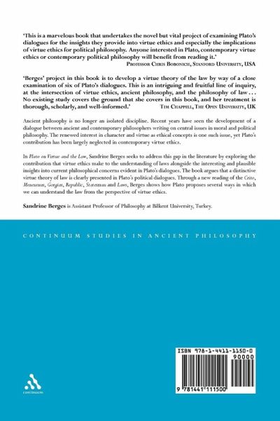 Ancient philosophy is no longer an isolated discipline. Recent years have seen the development of a dialogue between ancient and contemporary philosophers writing on central issues in moral and political philosophy. The renewed interest in character and virtue as ethical concepts is one such issue, yet Plato's contribution has been largely neglected in contemporary virtue ethics. In Plato on Virtue and the Law, Sandrine Berges seeks to address this gap in the literature by exploring the contribution that virtue ethics make to the understanding of laws alongside the interesting and plausible insights into current philosophical concerns evident in Plato's dialogues. The book argues that a distinctive virtue theory of law is clearly presented in Plato's political dialogues. Through a new reading of the Crito, Menexenus, Gorgias, Republic, Statesman and Laws, Berges shows how Plato proposes several ways in which we can understand the law from the perspective of virtue ethics.