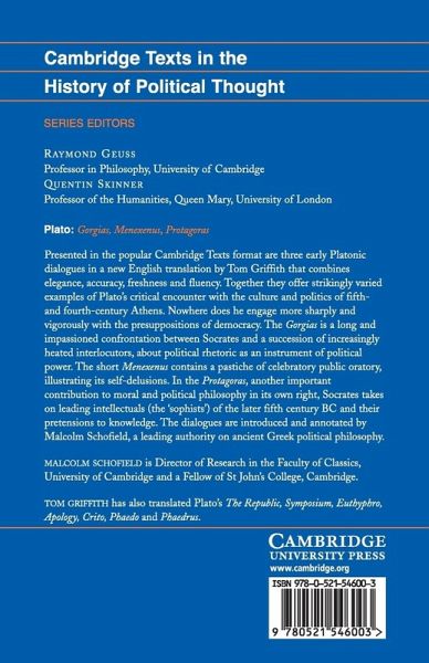 Presented in the popular Cambridge Texts format are three early Platonic dialogues in a new English translation by Tom Griffith that combines elegance, accuracy, freshness and fluency. Together they offer strikingly varied examples of Plato's critical encounter with the culture and politics of fifth and fourth century Athens. Nowhere does he engage more sharply and vigorously with the presuppositions of democracy. The Gorgias is a long and impassioned confrontation between Socrates and a succession of increasingly heated interlocutors about political rhetoric as an instrument of political power. The short Menexenus contains a pastiche of celebratory public oratory, illustrating its self-delusions. In the Protagoras, another important contribution to moral and political philosophy in its own right, Socrates takes on leading intellectuals (the 'sophists') of the later fifth century BC and their pretensions to knowledge. The dialogues are introduced and annotated by Malcolm Schofield, a leading authority on ancient Greek political philosophy.