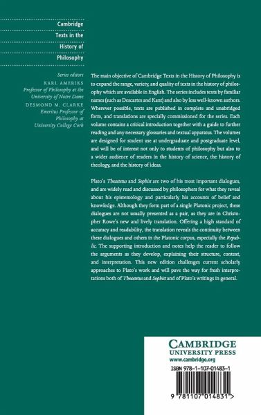 Plato's Theaetetus and Sophist are two of his most important dialogues, and are widely read and discussed by philosophers for what they reveal about his epistemology and particularly his accounts of belief and knowledge. Although they form part of a single Platonic project, these dialogues are not usually presented as a pair, as they are in Christopher Rowe's new and lively translation. Offering a high standard of accuracy and readability, the translation reveals the continuity between these dialogues and others in the Platonic corpus, especially the Republic. The supporting introduction and notes help the reader to follow the arguments as they develop, explaining their structure, context and interpretation. This new edition challenges current scholarly approaches to Plato's work and will pave the way for fresh interpretations both of Theaetetus and Sophist and of Plato's writings in general.