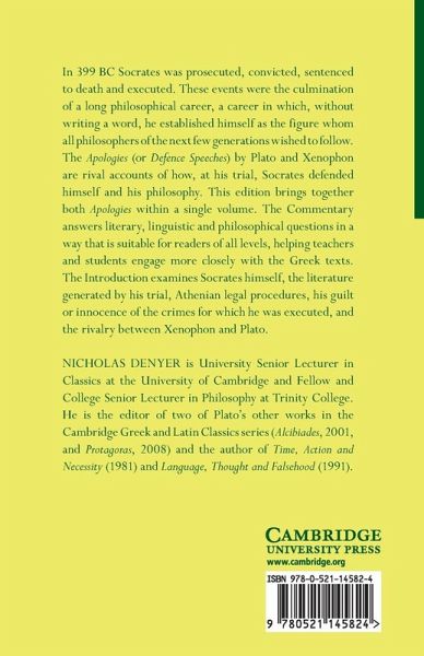 Provides an edition suitable for students of Plato and Xenophon's accounts of how Socrates, on trial for his life, defended himself and his philosophy. The Commentary explores literary, linguistic, and philosophical aspects, while the Introduction discusses Socrates, his philosophy, Socratic dialogues, and Athenian legal procedures.