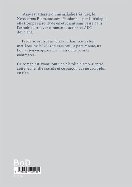 Amy est atteinte d'une maladie très rare, le Xeroderma Pigmentosum. Passionnée par la biologie, elle trompe sa solitude en étudiant sans cesse dans l'espoir de trouver comment guérir son ADN déficient.Frédéric est lycéen, brillant dans toutes les matières, mais lui aussi très seul, à part Momo, un bon à rien en apparence, mais doué pour le commerce.Ce roman est avant tout une histoire d'amour entre cette jeune fille malade et ce garçon qui ne croit plus en rien.