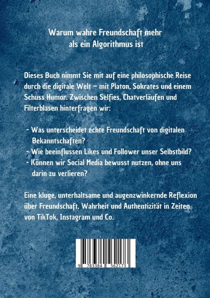 Dieses Buch verbindet Philosophie und Social Media - mit einem Augenzwinkern. Es stellt die Frage: Was bedeutet Freundschaft in Zeiten von Likes, Followern und Algorithmen?Kernfragen des Buches: - Ist eine platonische Freundschaft online genauso tief wie im echten Leben? - Leben wir in einer digitalen Version von Platons Höhle, in der wir nur Schatten der Realität sehen? -Was würde Sokrates auf Twitter posten - und wie würden seine Follower reagieren? - Können wir Social Media bewusst nutzen, ohne darin gefangen zu sein?Das Buch schlägt eine Brücke zwischen antiker Weisheit und der digitalen Gegenwart. Es analysiert, wie Social Media unsere Beziehungen, unsere Identität und unser Denken formt - und wie wir es philosophisch klug und mit Humor nutzen können.Ein kluger, unterhaltsamer und augenzwinkernder Blick auf die digitale Welt - für alle, die sich zwischen Philosophie und Emojis bewegen.Philosophie trifft Popkultur - leicht verständlich, aber tiefsinnig.Humorvoll, aber mit Substanz - perfekt für philosophisch Interessierte und Social-Media-Nutzer gleichermaßen.Praktische Reflexionen - mit Tipps für einen bewussteren Umgang mit digitalen Beziehungen.