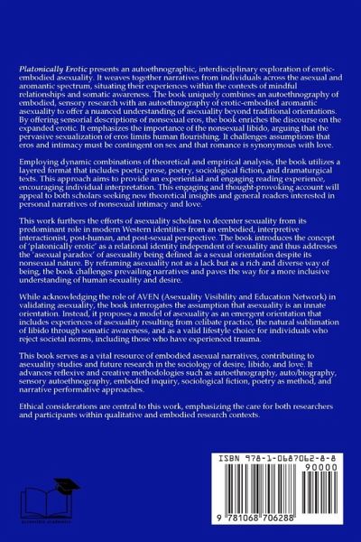 Platonically Erotic presents an autoethnographic, interdisciplinary exploration of erotic-embodied asexuality. It weaves together narratives from individuals across the asexual and aromantic spectrum, situating their experiences within the contexts of mindful relationships and somatic awareness. The book uniquely combines an autoethnography of embodied, sensory research with an autoethnography of erotic-embodied aromantic asexuality to offer a nuanced understanding of asexuality beyond traditional orientations. By offering sensorial descriptions of nonsexual eros, the book enriches the discourse on the expanded erotic. It emphasizes the importance of the nonsexual libido, arguing that the pervasive sexualization of eros limits human flourishing. It challenges assumptions that eros and intimacy must be contingent on sex and that romance is synonymous with love. Employing dynamic combinations of theoretical and empirical analysis, the book utilizes a layered format that includes poetic prose, poetry, sociological fiction, and dramaturgical texts. This approach aims to provide an experiential and engaging reading experience, encouraging individual interpretation. This engaging and thought-provoking account will appeal to both scholars seeking new theoretical insights and general readers interested in personal narratives of nonsexual intimacy and love. This work furthers the efforts of asexuality scholars to decenter sexuality from its predominant role in modern Western identities from an embodied, interpretive interactionist, post-human, and post-sexual perspective. The book introduces the concept of 'platonically erotic' as a relational identity independent of sexuality and thus addresses the 'asexual paradox' of asexuality being defined as a sexual orientation despite its nonsexual nature. By reframing asexuality not as a lack but as a rich and diverse way of being, the book challenges prevailing narratives and paves the way for a more inclusive understanding of human sexuality and desire. While acknowledging the role of AVEN (Asexuality Visibility and Education Network) in validating asexuality, the book interrogates the assumption that asexuality is an innate orientation. Instead, it proposes a model of asexuality as an emergent orientation that includes experiences of asexuality resulting from celibate practice, the natural sublimation of libido through somatic awareness, and as a valid lifestyle choice for individuals who reject societal norms, including those who have experienced trauma.This book serves as a vital resource of embodied asexual narratives, contributing to asexuality studies and future research in the sociology of desire, libido, and love. It advances reflexive and creative methodologies such as autoethnography, auto/biography, sensory autoethnography, embodied inquiry, sociological fiction, poetry as method, and narrative performative approaches. Ethical considerations are central to this work, emphasizing the care for both researchers and participants within qualitative and embodied research contexts.