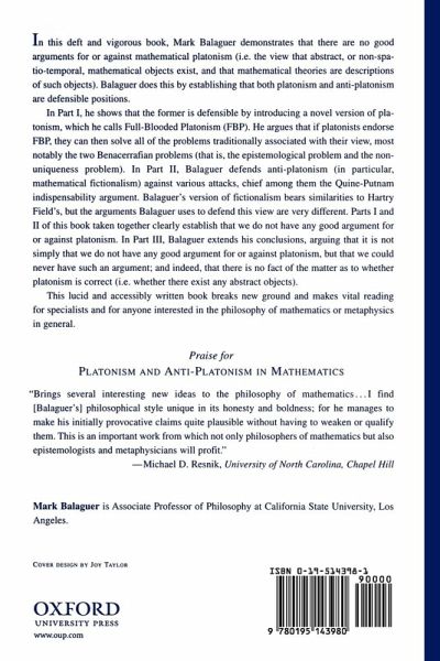 In this deft and vigorous book, Mark Balaguer demonstrates that there are no good arguments for or against mathematical platonism (i.e., the view that abstract, or non-spatio-temporal, mathematical objects exist, and that mathematical theories are descriptions of such objects). Balaguer does this by establishing that both platonism and anti-platonism are defensible positions. In Part I, he shows that the former is defensible by introducing a novel version of platonism, which he calls full-blooded platonism, or FBP. He argues that if platonists endorse FBP, they can then solve all of the problems traditionally associated with their view, most notably the two Benacerrafian problems (that is, the epistemological problem and the non-uniqueness problem). In Part II, Balaguer defends anti-platonism (in particular, mathematical fictionalism) against various attacks, chief among them the Quine-Putnam indispensability argument. Balaguer's version of fictionalism bears similarities to Hartry Field's, but the arguments Balaguer uses to defend this view are very different. Parts I and II of this book taken together clearly establish that we do not have any good argument for or against platonism. In Part III, Balaguer extends his conclusions, arguing that it is not simply that we do not currently have any good argument for or against platonism, but that we could never have such an argument, and indeed, that there is no fact of the matter as to whether platonism is correct (ie., whether there exist any abstract objects). This lucid and accessibly written book breaks new ground in its area of engagement and makes vital reading for both specialists and anyone else interested in the philosophy of mathematics or metaphysics in general.