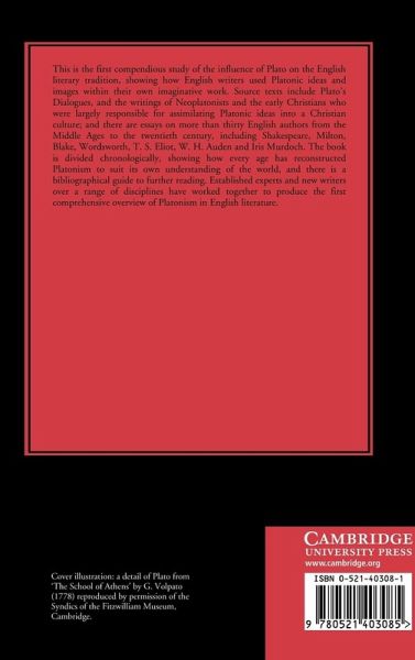 This is the first compendious study of the influence of Platonism on the English literary tradition, showing how English writers used Platonic themes and images within their own imaginative work. Source texts include Plato's Dialogues, and the writings of Neoplatonists and the early Christians who were largely responsible for assimilating Platonic ideas into a Christian culture; and there are essays on more than thirty English authors from the Middle Ages to the twentieth century, including Shakespeare, Milton, Blake, Wordsworth, Yeats, Pound and Iris Murdoch. Each chronological section has its own introduction to highlight how every age has reconstructed Platonism to suit its own understanding of the world, and there is a bibliographical guide to further reading. Established experts and new writers over a range of disciplines have worked together to produce the first comprehensive overview of Platonism in English literature.