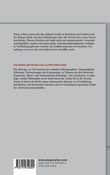 Die Arbeit eröffnet die Möglichkeit, die verschiedenen Komponenten von Platons Kritik an Gelderwerb und Reichtum zu einer kohärenten Theorie zu verbinden und auf der Basis von Textanalysen ihren philosophischen Gehalt zu prüfen.