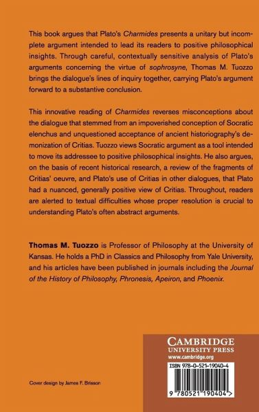 This book argues that Plato's Charmides presents a unitary but incomplete argument intended to lead its readers to substantive philosophical insights. Through careful, contextually sensitive analysis of Plato's arguments concerning the virtue of sophrosyne, Thomas M. Tuozzo brings the dialogue's lines of inquiry together, carrying Plato's argument forward to a substantive conclusion. This innovative reading of Charmides reverses misconceptions about the dialogue that stemmed from an impoverished conception of Socratic elenchus and unquestioned acceptance of ancient historiography's demonization of Critias. It views Socratic argument as a tool intended to move its addressee to substantive philosophical insights. It also argues, on the basis of recent historical research, a review of the fragments of Critias' oeuvre and Plato's use of Critias in other dialogues, that Plato had a nuanced, generally positive view of Critias. Throughout, readers are alerted to textual difficulties whose proper resolution is crucial to understanding Plato's often abstract arguments.
