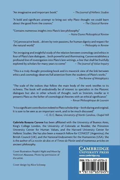 Although a great deal has been written on Plato's ethics, his cosmology has not received so much attention in recent times and its importance for his ethical thought has remained underexplored. By offering accounts of Timaeus, Philebus, Politicus and Laws X, the book reveals a strongly symbiotic relation between the cosmic and human sphere. It is argued that in his late period Plato presents a picture of an organic universe, endowed with structure and intrinsic value, which both urges our respect and calls for our responsible intervention. Humans are thus seen as citizens of a university that can provide a context for their flourishing even in the absence of good political institutions. The book sheds light on many intricate metaphysical issues in late Plato and brings out the close connections between his cosmology and the development of his ethics.