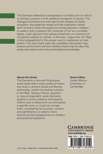 This Element defends an interpretation of Plato's Ion on which its primary concern is with audience reception of poetry. The dialogue presents the character of Ion as a comedic figure, a self-ignorant fool whose foolishness is a function of his passive relation to Homer.