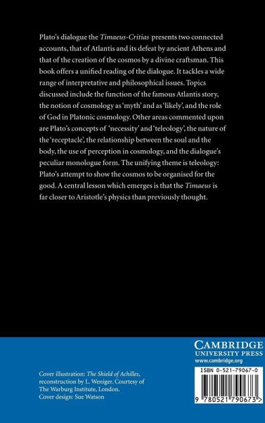 Plato's dialogue the Timaeus-Critias presents two connected accounts, that of the story of Atlantis and its defeat by ancient Athens and that of the creation of the cosmos by a divine craftsman. This book offers a unified reading of the dialogue. It tackles a wide range of interpretative and philosophical issues. Topics discussed include the function of the famous Atlantis story, the notion of cosmology as 'myth' and as 'likely', and the role of God in Platonic cosmology. Other areas commented upon are Plato's concepts of 'necessity' and 'teleology', the nature of the 'receptacle', the relationship between the soul and the body, the use of perception in cosmology, and the work's peculiar monologue form. The unifying theme is teleology: Plato's attempt to show the cosmos to be organised for the good. A central lesson which emerges is that the Timaeus is closer to Aristotle's physics than previously thought.