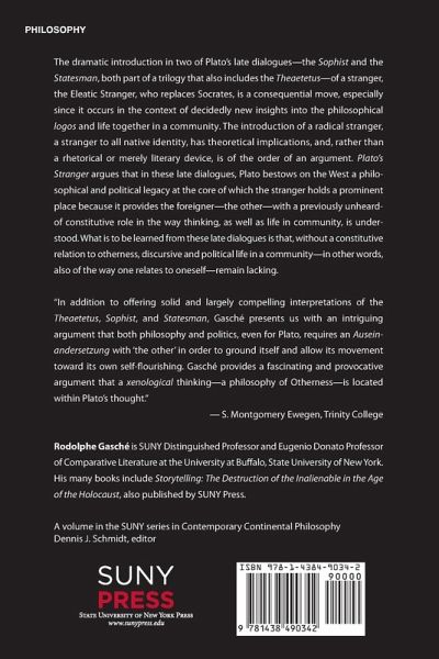 The dramatic introduction in two of Plato's late dialogues¿the Sophist and the Statesman, both part of a trilogy that also includes the Theaetetus¿of a stranger, the Eleatic Stranger, who replaces Socrates, is a consequential move, especially since it occurs in the context of decidedly new insights into the philosophical logos and life together in a community. The introduction of a radical stranger, a stranger to all native identity, has theoretical implications, and, rather than a rhetorical or merely literary device, is of the order of an argument. Plato's Stranger argues that in these late dialogues, Plato bestows on the West a philosophical and political legacy at the core of which the stranger holds a prominent place because it provides the foreigner¿the other¿with a previously unheard-of constitutive role in the way thinking, as well as life in community, is understood. What is to be learned from these late dialogues is that, without a constitutive relation to otherness, discursive and political life in a community¿in other words, also of the way one relates to oneself¿remain lacking.