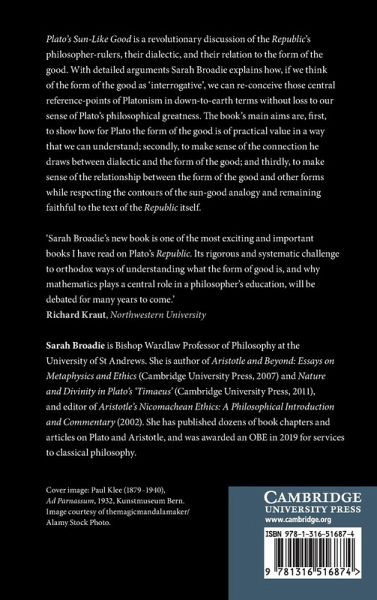 Part 1. Approaching the Sun-Good Analogy: 1.1 Introductory 1.2 The philosopher-rulers' intellectual task 1.3 'The most important thing to learn': Between plural and singular 1.4 What further knowledge does the longer way achieve? Part 2. The Form of the Good and Knowledge: 2.1 Sun, cave, and sun again 2.2 Connecting sun and line 2.3 Higher and lower intellectual levels 2.4 Mathematical versus dialectical hypotheses 2.5 Saph¿neia 2.6 The form of the good as non-hypothetical principle 2.7 Dialectic and the good: Some questions 2.8 The role of the form of the good in dialectic 2.9 Some objections and replies 2.10 Textual counterevidence 2.11 The non-hypothetical principle as first premiss? 2.12 The form of the good as object of definition? 2.13 Dialectic and experience 2.14 Diagrams, dialectic, and context 2.15 Dialectic in government 2.16 Not rigorous enough? 2.17 Why is dialectic cognitively superior to mathematics? 2.18 Why are we shown so little about dialectic in the Republic? 2.19 True philosophers versus sight-lovers 2.20 Criteria and scope of 'good' 2.21 Main positions of Parts 1 and 2 Part 3. The Form of the Good and Being: 3.1 Preliminaries 3.2 First proposal 3.3 Interim discussion of 505a2-4 3.4 Second proposal 3.5 Perfectionist accounts 3.6 System accounts Part 4. Various Further Questions: 4.1 Ambiguity of 'the good' (I) 4.2 Ambiguity of 'the good' (II) 4.3 Why the mathematical education? 4.4 Cosmology, theology Part 5. Winding Up.