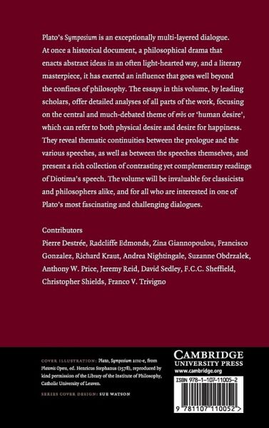 Plato's Symposium is an exceptionally multi-layered dialogue. At once a historical document, a philosophical drama that enacts abstract ideas in an often light-hearted way, and a literary masterpiece, it has exerted an influence that goes well beyond the confines of philosophy. The essays in this volume, by leading scholars, offer detailed analyses of all parts of the work, focusing on the central and much-debated theme of er¿s or 'human desire' - which can refer both to physical desire or desire for happiness. They reveal thematic continuities between the prologue and the various speeches as well as between the speeches themselves, and present a rich collection of contrasting yet complementary readings of Diotima's speech. The volume will be invaluable for classicists and philosophers alike, and for all who are interested in one of Plato's most fascinating and challenging dialogues.