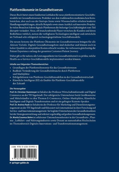 Inhalte aus folgenden ThemenbereichenDie Grundlagen der Plattformökonomie für das Gesundheitswesen verstehenWie Plattformen und Marktplätze das Gesundheitswesen verändernErfolgsfaktoren von Plattform-Geschäftsmodellen im GesundheitswesenKI als Enabler für Plattform-Geschäftsmodelle der ZukunftMit Beiträgen von:Dr. med. Henri Michael von Blanquet - Precision Medicine Alliance, Föhr, DeutschlandTobias Chrobok - Erlangen, DeutschlandTimo Frank - Ada Health GmbH, Berlin, DeutschlandJulian Gansen - Mementor GmbH, Berlin, DeutschlandClemens von Guenther - Universität Augsburg, Augsburg, DeutschlandAnisa Idris - Ada Health GmbH, Berlin, DeutschlandDr. Florian Koerber - Flying Health GmbH, Berlin, DeutschlandDr. Lara Maier - goetzpartners Holding AG, München, DeutschlandMarius Mainz - GET.ON Institut für Online Gesundheitstrainings GmbH, Berlin, DeutschlandManon Mandel - München, DeutschlandProf. Dr. Alessandro Monti - CBS International Business School, Köln, DeutschlandProf. Dr. Volker Nürnberg - BearingPoint GmbH, Frankfurt, DeutschlandProf. Dr. Erika Raab - MSH Medical School Hamburg, Hamburg, DeutschlandProf. Dr. Christoph Rasche - Universität Potsdam, Potsdam, DeutschlandProf. Dr. Dominik Rottenkolber - Alice Salomon Hochschule Berlin, Berlin, DeutschlandDr. Alexander Schachinger - EPatient Analytics GmbH, Berlin, DeutschlandFrank Stratmann - SMARTR.care, Schmallenberg, DeutschlandSophia Strube - Ada Health GmbH, Berlin, DeutschlandMario Unterbrunner - CHECK24 Vergleichsportal, München, DeutschlandStephanie Widmaier - BearingPoint GmbH, Frankfurt, DeutschlandHenry Alexander Wittke - Helmut-Schmidt-Universität, Hamburg