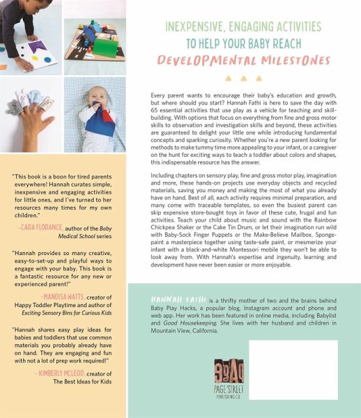 Inexpensive, Engaging Activities to Help Your Baby Reach Developmental Milestones Every parent wants to encourage their baby's education and growth, but where should you start? Hannah Fathi is here to save the day with 65 essential activities that use play as a vehicle for teaching and skill- building. With options that focus on everything from fine and gross motor skills to observation and investigation skills and beyond, these activities are guaranteed to delight your little one while introducing fundamental concepts and sparking curiosity. Whether you're a new parent looking for methods to make tummy time more appealing to your infant, or a caregiver on the hunt for exciting ways to teach a toddler about colors and shapes, this indispensable resource has the answer. Including chapters on sensory play, fine and gross motor play, imagination and more, these hands-on projects use everyday objects and recycled materials, saving you money and making the most of what you already have on hand. Best of all, each activity requires minimal preparation, and many come with traceable templates, so even the busiest parent can skip expensive store-bought toys in favor of these cute, frugal and fun activities. Teach your child about music and sound with the Rainbow Chickpea Shaker or the Cake Tin Drum, or let their imagination run wild with Baby-Sock Finger Puppets or the Make-Believe Mailbox. Sponge- paint a masterpiece together using taste-safe paint, or mesmerize your infant with a black and white Montessori mobile they won't be able to look away from. With Hannah's expertise and ingenuity, learning and development have never been easier or more enjoyable.