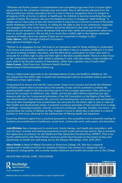 "Whitaker and Tonkin present a comprehensive and compelling argument from a human rights perspective for the correlation between play and health. Play is definitively elevated from the still prevalent but archaic perception that it's a nice to have to recognition that it is integral to all aspects of life- at home, in school, in healthcare- for children to become everything they are capable of being. The authors call upon the healthcare sector to engage in "rebel thinking" to realise and act upon play as the very resource that is required as a solution to some of the public health challenges of the 21st Century. In calling for the right to play to be understood, respected and engaged with, they assert that children would be allowed to play their part in their own childhoods and systems could be developed that serve their needs and perspectives rather than from an adult's perception. We are left in no doubt that a child's right to the highest attainable standard of health cannot be realized if they are not supported to engage in play."