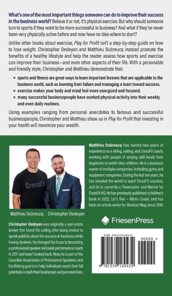 What's one of the most important things someone can do to improve their success in the business world? Believe it or not, it's physical exercise. But why should someone turn to sports if they want to be more successful in business? And what if they've never been very physically active before and now have no idea where to start? Unlike other books about exercise, Play for Profit isn't a step-by-step guide on how to lose weight. Christopher Dedeyan and Matthieu Dubreucq instead promote the benefits of a healthy lifestyle and help the reader assess how sports and exercise can improve their business-and even other aspects of their life. With a personable and friendly style, Christopher and Matthieu demonstrate that: ¿ sports and fitness are great ways to learn important lessons that are applicable to the business world, such as learning from failure and managing a team toward success. ¿ exercise makes your body and mind feel more energized and focused. ¿ many successful businesspeople have worked physical activity into their weekly and even daily routines. Using examples ranging from personal anecdotes to famous and successful businesspeople, Christopher and Matthieu show us in Play for Profit that investing in your health will maximize your wealth.
