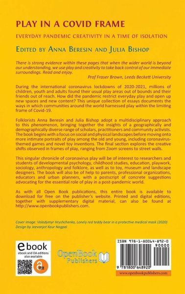 During the international coronavirus lockdowns of 2020-2021, millions of children, youth, and adults found their usual play areas out of bounds and their friends out of reach. How did the pandemic restrict everyday play and how did the pandemic offer new spaces and new content? This unique collection of essays documents the ways in which communities around the world harnessed play within the limiting frame of Covid-19. Folklorists Anna Beresin and Julia Bishop adopt a multidisciplinary approach to this phenomenon, bringing together the insights of a geographically and demographically diverse range of scholars, practitioners, and community activists. The book begins with a focus on social and physical landscapes before moving onto more intimate portraits of play among the old and young, including coronavirus-themed games and novel toy inventions. Finally, the co-authors explore the creative shifts observed in frames of play, ranging from Zoom screens to street walls. This singular chronicle of coronavirus play will be of interest to researchers and students of developmental psychology, childhood studies, education, playwork, sociology, anthropology and folklore, as well as to toy, museum, and landscape designers. This book will also be of help to parents, professional organizations, educators, and urban planners, with a postscript of concrete suggestions advocating for the essential role of play in a post-pandemic world.