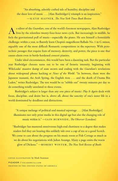 Play It Again is the Guardian editor's account of a remarkable musical challenge during an extraordinary year for news. As editor of the Guardian, one of the world's foremost newspapers, Alan Rusbridger abides by the relentless twenty-four-hour news cycle. But increasingly in midlife, he feels the gravitational pull of music-especially the piano. He sets himself a formidable challenge: to fluently learn Chopin's magnificent Ballade No. 1 in G minor, arguably one of the most difficult Romantic compositions in the repertory. With pyrotechnic passages that require feats of memory, dexterity, and power, the piece is one that causes alarm even in battle-hardened concert pianists. He gives himself a year. Under ideal circumstances, this would have been a daunting task. But the particular year Rusbridger chooses turns out to be one of frenetic intensity. As he writes in his introduction, "Perhaps if I'd known then what else would soon be happening in my day job, I might have had second thoughts. For it would transpire that, at the same time, I would be steering the Guardian through one of the most dramatic years in its history." It was a year that began with WikiLeaks' massive dump of state secrets and ended with the Guardian's revelations about widespread phone hacking at News of the World. "In between, there were the Japanese tsunami, the Arab Spring, the English riots . . . and the death of Osama Bin Laden," writes Rusbridger. The test would be to "nibble out" twenty minutes per day to do something totally unrelated to the above. Rusbridger's description of mastering the Ballade is hugely engaging, yet his subject is clearly larger than any one piece of classical music. Play It Again deals with focus, discipline, and desire but is, above all, about the sanctity of one's inner life in a world dominated by deadlines and distractions. What will you do with your twenty minutes?