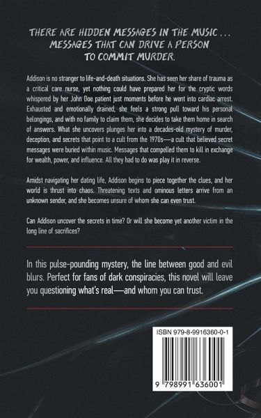 There are hidden messages in the music . . . messages that can drive a person to commit murder. Addison is no stranger to life-and-death situations. She has seen her share of trauma as a critical care nurse, yet nothing could have prepared her for the cryptic words whispered by her John Doe patient just moments before he went into cardiac arrest. Exhausted and emotionally drained, she feels a strong pull toward his personal belongings, and with no family to claim them, she decides to take them home in search of answers. What she uncovers plunges her into a decades-old mystery of murder, deception, and secrets that point to a cult from the 1970s-a cult that believed secret messages were buried within music. Messages that compelled them to kill in exchange for wealth, power, and influence. All they had to do was play it in reverse. Amidst navigating her dating life, Addison begins to piece together the clues, and her world is thrust into chaos. Threatening texts and ominous letters arrive from an unknown sender, and she becomes unsure of whom she can even trust. Can Addison uncover the secrets in time? Or will she become yet another victim in the long line of sacrifices? In this pulse-pounding mystery, the line between good and evil blurs. Perfect for fans of dark conspiracies, this novel will leave you questioning what's real-and whom you can trust.