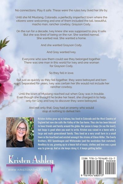 No connections. Play it safe. These were the rules Ivey lived her life by. Until she hit Mustang, Colorado, a perfectly imperfect town where the citizens were welcoming and one of them included the tall, beautiful, macho man, rancher cowboy, Grayson Cody. On the run for a decade, Ivey knew she was supposed to play it safe. But she was tired of being on the run. She wanted normal. She wanted real. She wanted a home. And she wanted Grayson Cody. And Gray wanted Ivey. Everyone who saw them could see they belonged together. There was one man in this world for Ivey and one woman for Grayson Cody. So they fell in love. But just as quickly as they fell together, they were betrayed and torn apart. Separated for years, Ivey was certain her life would not include her rancher cowboy. Until the town of Mustang reached out when Gray was in trouble. Even though she thought he broke her heart, she charged in to help, only for Gray and Ivey to discover they were betrayed. And not only that, Gray had an enemy who would stop at nothing to defeat him.