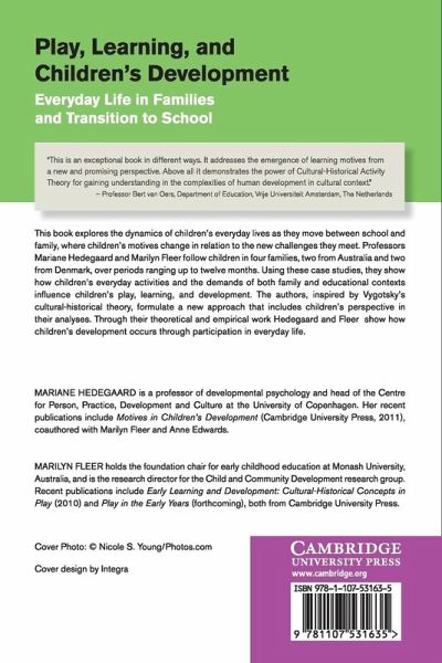 This book explores the dynamics in children's everyday lives as they move between school and the family, with particular consideration of how children's motives change in response to new challenges. Professors Mariane Hedegaard and Marilyn Fleer follow four children, two from Australia and two from Denmark, over a twelve-month period. Using these case studies, they show how children's everyday activities, play, and the demands of both family and educational contexts influence their learning and development. The authors contribute to a sociocultural theory formulation that includes the child's perspective in cultural historical contexts. Their approach yields insights that transcend specific nationalities, cultures, and socioeconomic situations. The analysis shows not just how children's family life shapes their experiences in school, but how schools influence and shape their lives at home.
