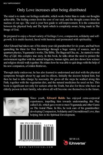 Be prepared to experience a wide spectrum of emotions; Love, compassion, solidarity and self-growth. It is multi-faceted, laced with humour and permeated with spirituality. After Edward had taken care of his ninety-year-old grandmother for six years, and had been quenching his thirst for True Knowledge through a huge variety of sources, such as; quantum physics, Yogananda's works, The Bible, The Bagavad Gita, etc. He started to write Play of Life; this complex true story. In this book, he talks about the environment, the need to protect the animal kingdom, human rights and also shows how science and religion should walk together. He relates how he was able to quit drugs with the help of his new companion, a golden retriever. He has learned to understand and deal with the physical symptoms brought about by age and its effects through daily endeavour. Initially the doctors helped him, but then he had to take charge by necessity. He gives all the steps he walked along this Path, together with the vegetarian diet, and the natural medicines he used on her. This book is significant not only for seekers after the Truth, but also for those who have an elderly person in their family, who above all will become one themselves in the future.