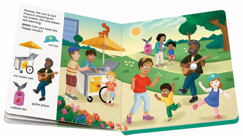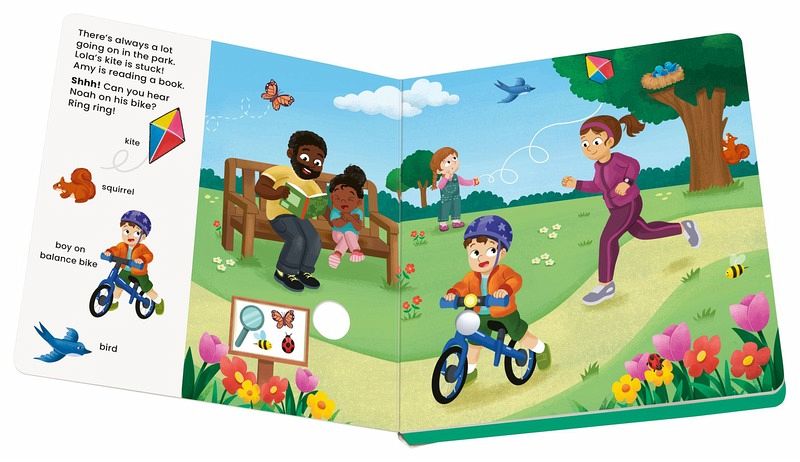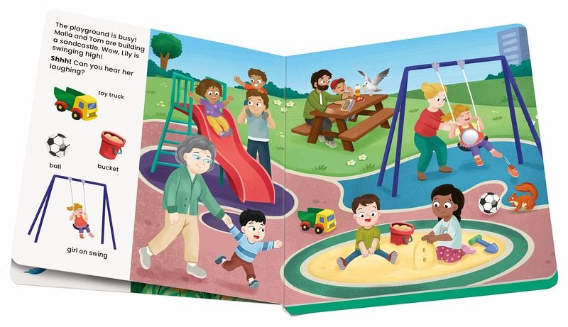 Have fun discovering the different sounds at the park with this colourful search and find book. Press the buttons to bring the park to life and help children recognise the different noises they might hear when they're out and about. This 12-page book is great to enjoy together or for independent play and discovery to prepare little ones for different environments in everyday life.
