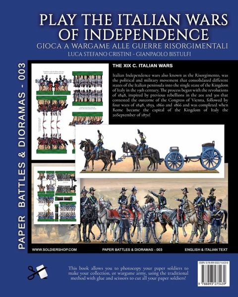 Play the Risorgimento wars with this wonderful book that contains over 30 complete and detailed tables of toy soldiers to be cut out for wargame or collecting! You will find armies from Austria, France, Piedmont, pre-unification kingdoms such as Bourbons and Pontiffs, Garibaldi and various patriots… All in 50 thick pages of hundreds of soldiers supplied in the standard scale of 25/28mm. So what are you waiting for? Put on your commanding general's epaulettes, equip yourself with a capable table, a practical ruler to measure, a pair of dice and get ready to lead hundreds or thousands of armies in epic and exciting battles of history! Giocate alle guerre risorgimentali con questo meraviglioso libro che contiene oltre 30 tavole complete e dettagliate di soldatini da ritagliare per wargame o collezionismo! Troverete armate di Austria, Francia, Piemonte, regni preunitari come Borbonici e pontifici, Garibaldini e patrioti vari… Il tutto in 50 pagine fitte di centinaia di soldati forniti nella scala standard di 25/28mm. Quindi cosa aspettate? Indossate le spalline da generale comandante, dotatevi di un capace tavolo, un pratico righello per misurare, un paio di dadi e preparatevi a guidare centinaia o migliaia di eserciti in epiche e appassionanti battaglie della storia!