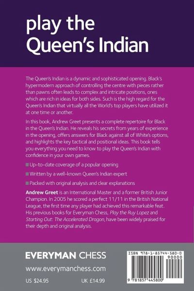 The Queen's Indian is a dynamic and flexible way to meet 1 d4. Using Nimzowitsch's principles, Black adopts the hypermodern plan of controlling the centre with pieces rather than the traditional idea of pawn occupation, and this approach often leads to complex and intricate positions rich in ideas both sides. Such is the high regard for the Queen's Indian that virtually all the world's top players have utilized it at one time or another. In this book Andrew Greet presents a complete repertoire for Black in the Queen's Indian. He reveals his secrets from years of experience in the opening, offers answers for Black against all of White's tries for an advantage, and highlights the principal tactical and positional plans for both White and Black. This book tells you everything you need to know to play the Queen's Indian with confidence in your own games.