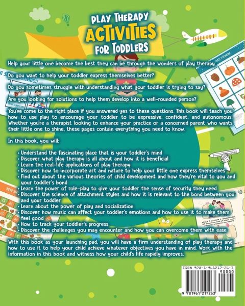 Help your little one become the best they can be through the wonders of play therapy. Do you want to help your toddler express themselves better? Do you sometimes struggle with understanding what your toddler is trying to say? Are you looking for solutions to help them develop into a well-rounded person? You've come to the right place if you answered yes to these questions. This book will teach you how to use play to encourage your toddler to be expressive, confident, and autonomous. Whether you're a therapist looking to enhance your practice or a concerned parent who wants their little one to shine, these pages contain everything you need to know. In this book, you will: Understand the fascinating place that is your toddler's mind Discover what play therapy is all about and how it is beneficial Learn the real-life applications of play therapy Discover how to incorporate art and nature to help your little one express themselves Find out about the various theories of child development and how they're vital to you and your toddler's bond Learn the power of role-play to give your toddler the sense of security they need Discover the science of attachment styles and how it is relevant to the bond between you and your toddler Learn about the power of play and socialization Discover how music can affect your toddler's emotions and how to use it to make them feel good How to track your toddler's progress Discover the challenges you may encounter and how you can overcome them with ease With this book as your launching pad, you will have a firm understanding of play therapy and how to use it to help your child achieve whatever objectives you have in mind. Work with the information in this book and witness how your child's life rapidly improves.