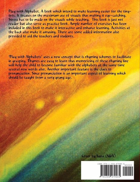 Play with Alphabet. A book which intend to make learning easier for the tiny-tots. It focuses on the maximum use of visuals thus making it eye-catching. Stress has to be made on the visuals while teaching. This book is not just reader but also serve as practice book. Ample number of exercises has been included in each book to make it interactive and enhance learning. Activities at the back also make it amusing. There are some added information also provided to aid the teachers and students. Moreover 'Play with Alphabets' uses a new concept that is rhyming schemes to facilitate in grasping. Rhymes are easy to learn thus memorizing of these rhyming line will help the child to become familiar with the alphabets at the same time several new words also. Another important feature is the clues to pronunciation. Since pronunciation is an important aspect of learning which should be taught from a very young age.