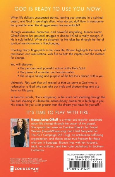 Play with Fire, the debut book by popular speaker and teacher Bianca Juarez Olthoff, is a bible-infused message for women that will help them gain new insight into Godâ s character, discover the personal, powerful nature of the Holy Spirit, and understand the fire God places in each person to fulfill their God-given calling and Kingdom purpose.