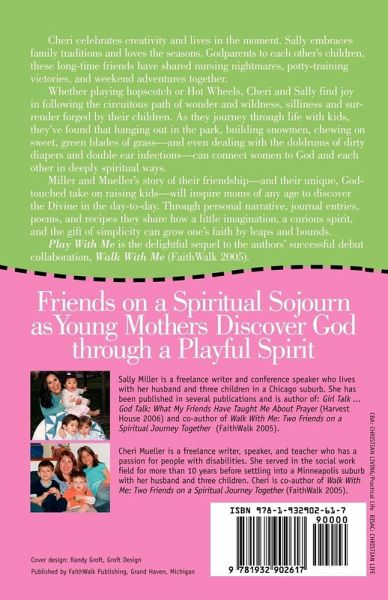 Second book in series by authors Sally Miller and Cheri Mueller Inspires mothers to draw closer to God through relationships with their children and each other. Follow up to the successful Walk With Me (FaithWalk 2005). Two young moms, writers, and fellow Wheaton College grads weave personal stories, recipes, and poetry around the theme of seeing God through the eyes of their children. Play With Me inspires women to celebrate the sacred beauty of God in ordinary life by following their children'' simple, playful, forward-tumbling lead. The authors share honestly about their mothering challenges and joys while rejoicing in the shared gift of life with children. Sally Miller is a freelance writer and conference speaker who lives with her husband and three children in a Chicago suburb. She has been published in several publications and is author of: Girl Talk . . . God Talk: What My Friends Have Taught Me About Prayer (Harvest House 2006) and co-author of Walk With Me: Two Friends on a Spiritual Journey Together (FaithWalk 2005). Cheri Mueller is a freelance writer, speaker and teacher who has a passion for people with disabilities.She served in the social work field for over ten years before settling into a Minneapolis suburb with her husband and three children. Cheri is co-author of Walk With Me: Two Friends on a Spiritual Journey Together (FaithWalk 2005).
