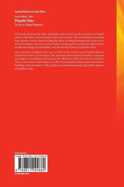 This book addresses the topic of playable cities, which use the 'smartness' of digital cities to offer their citizens playful events and activities. The contributions presented here examine various aspects of playable cities, including developments in pervasive and urban games, the use of urban data to design games and playful applications, architecture design and playability, and mischief and humor in playable cities. The smartness of digital cities can be found in the sensors and actuators that are embedded in their environment. This smartness allows them to monitor, anticipate and support our activities and increases the efficiency of the cities and our activities. These urban smart technologies can offer citizens playful interactions with streets, buildings, street furniture, traffic, public art and entertainment, large public displays and public events.