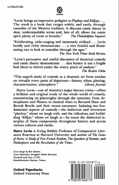 Harry Levin--one of America's major literary critics--offers a brilliant and original study of the whole world of comedy, concentrating on playwrights through the centuries, from Aristophanes and Plautus in classical times to Bernard Shaw and Bertolt Brecht and their recent successors. Viewing the comic repertory as a richly varied yet broadly unified whole, Levin provides a synthesis of theories and practice. Isolating two fundamental aspects of comedy--the ludicrous and irreverent "playboy," whom we laugh with, and the ridiculous and forbidding "killjoy," whom we laugh at--he traces the dialectical interplay of these components throughout history and across various cultures and media. While mainly focusing on the plays and the stage, with discussions of such major dramatists as Shakespeare, Ben Jonson, Moliere, and William Congreve, Levin also includes essays on such related topics as humor, satire, and games.