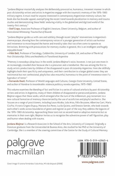 This volume examines the blending of fact and fiction in a series of cultural artefacts by post-dictatorship writers and artists in Argentina, many of them children of disappeared or persecuted parents. Jordana Blejmar argues that these works, which emerged after the turn of the millennium, pay testament to a new cultural formation of memory characterised by the use of autofiction and playful aesthetics. She focuses on a range of practitioners, including Laura Alcoba, Lola Arias, Félix Bruzzone, Albertina Carri, María Giuffra, Victoria Grigera Dupuy, Mariana Eva Perez, Lucila Quieto, and Ernesto Semán, who look towards each other's works across boundaries of genre and register as part of the way they address the legacies of the 1976-1983 dictatorship. Approaching these works not as second-hand or adoptive memories but as memories in their own right, Blejmar invites us to recognise the subversive power of self-figuration, play and humour when dealing with trauma.
