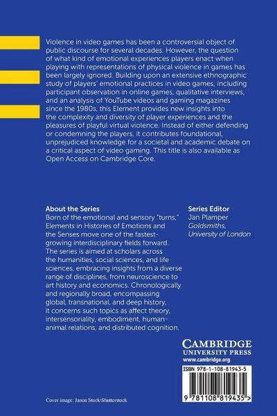 Violence in video games has been a controversial object of public discourse for several decades. Building upon an extensive ethnographic study of players' emotional practices,this Element provides new insights into the complexity and pleasures of player experiences, contributing to societal and academic debate on a critical aspect of video gaming.